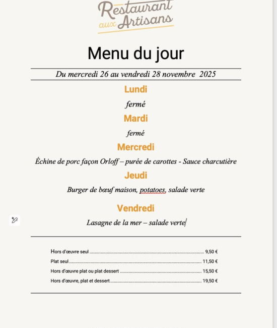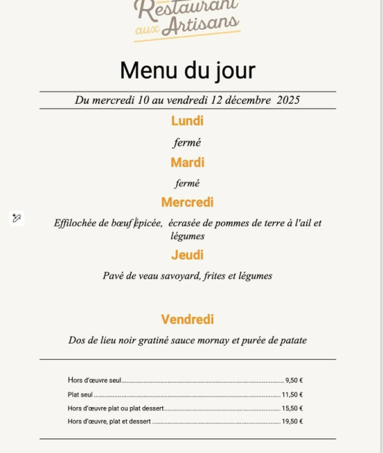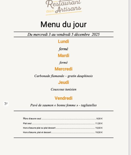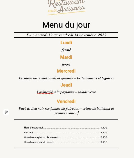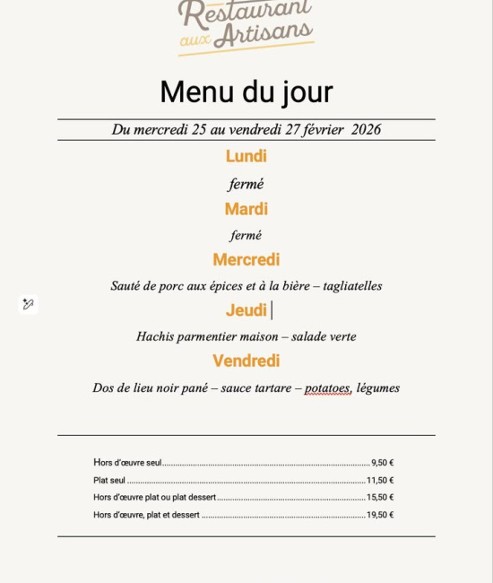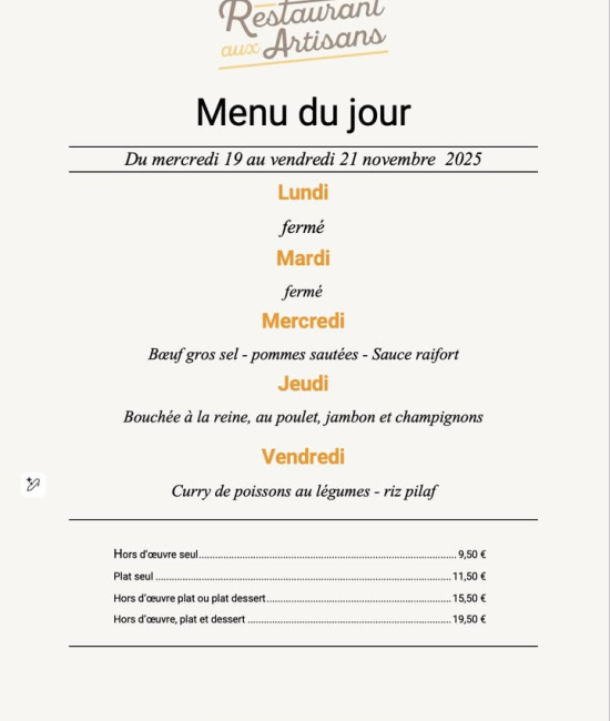 03.88.63.12.20 restaurantauxartisans@gmail.comLes horaires du restaurant :